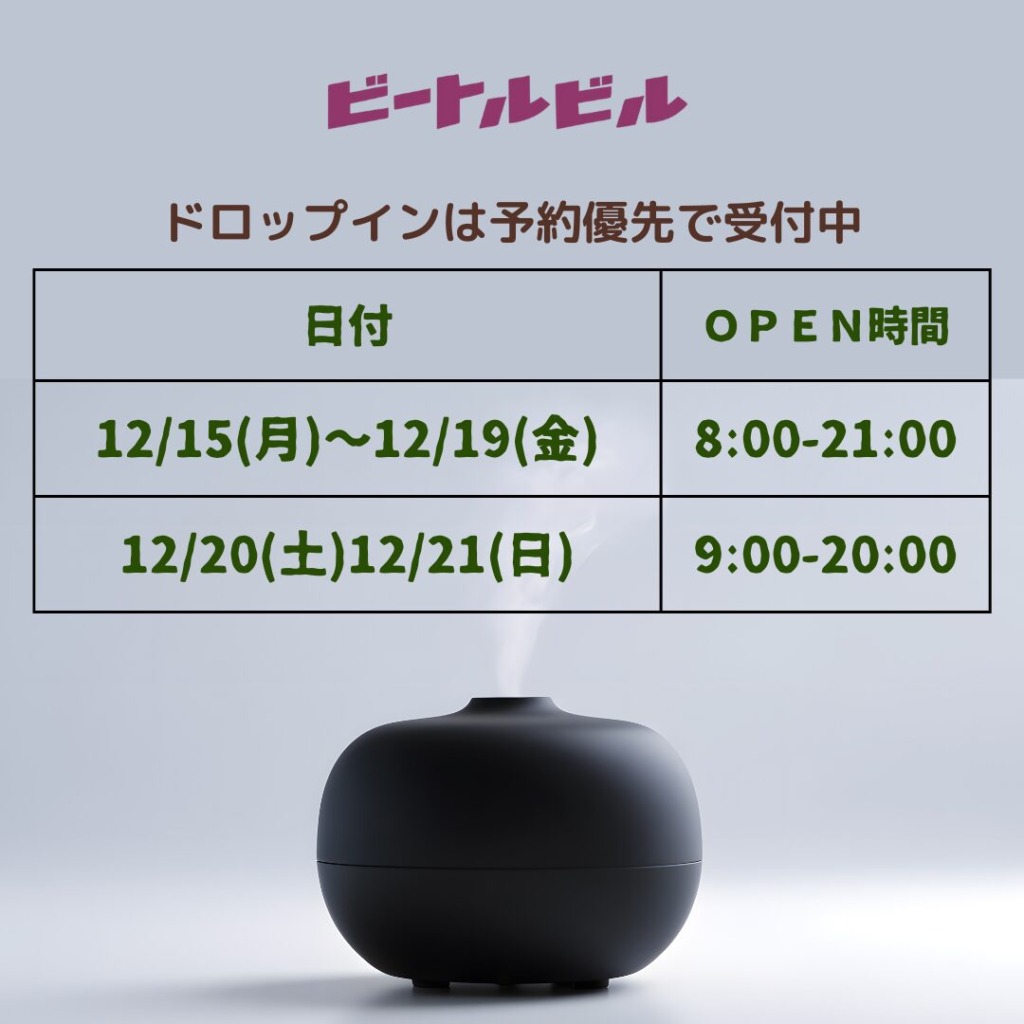 ☆12月15日 (月) 8:00~21:00 ( ドロップインは予約優先)☆12月16日 (火) 8:00~21:00 ( ドロップインは予約優先)☆12月17日 (水) 8:00~21:00 ( ド…
