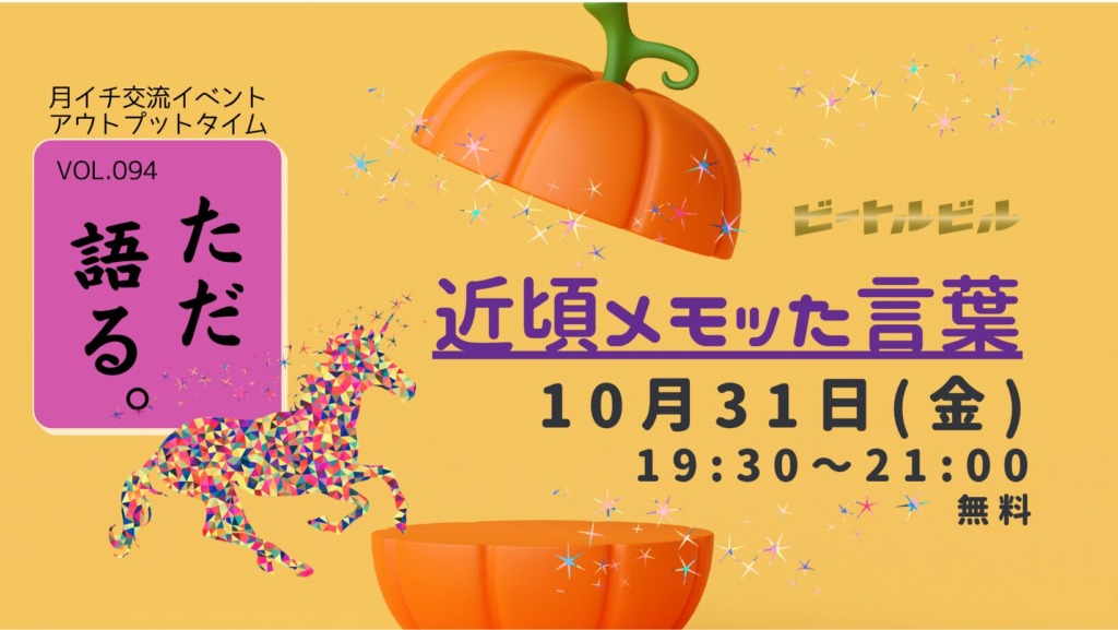 「近頃メモった言葉」―ただ語る。 10月31日(金)19時30分くらいからゆるりと始めます。 特に申し込みはございません。お時間目安にお集まりください。80分割る参加者数で一人当たり持ち時間が決まりま…