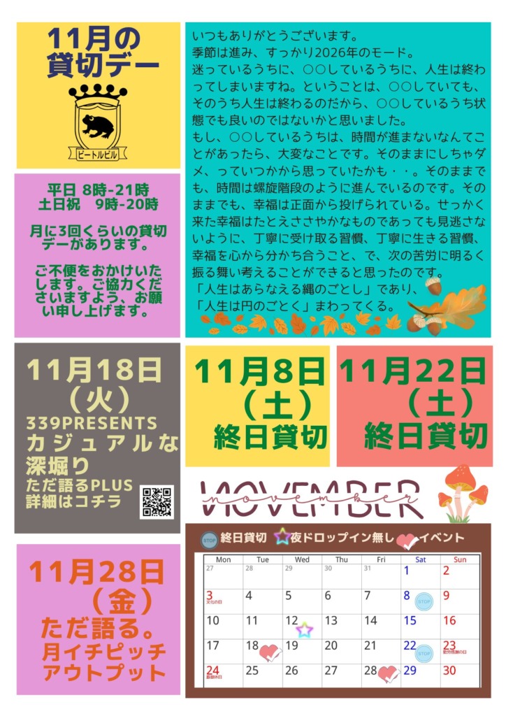 ***11月の貸切デー*** 11月8日(土)終日貸切 11月18日(火)カジュアルな深堀り(19:00-20:00) 11月22日(土)終日貸切 11月28日(金)ただ語る。(19:30-21:00…