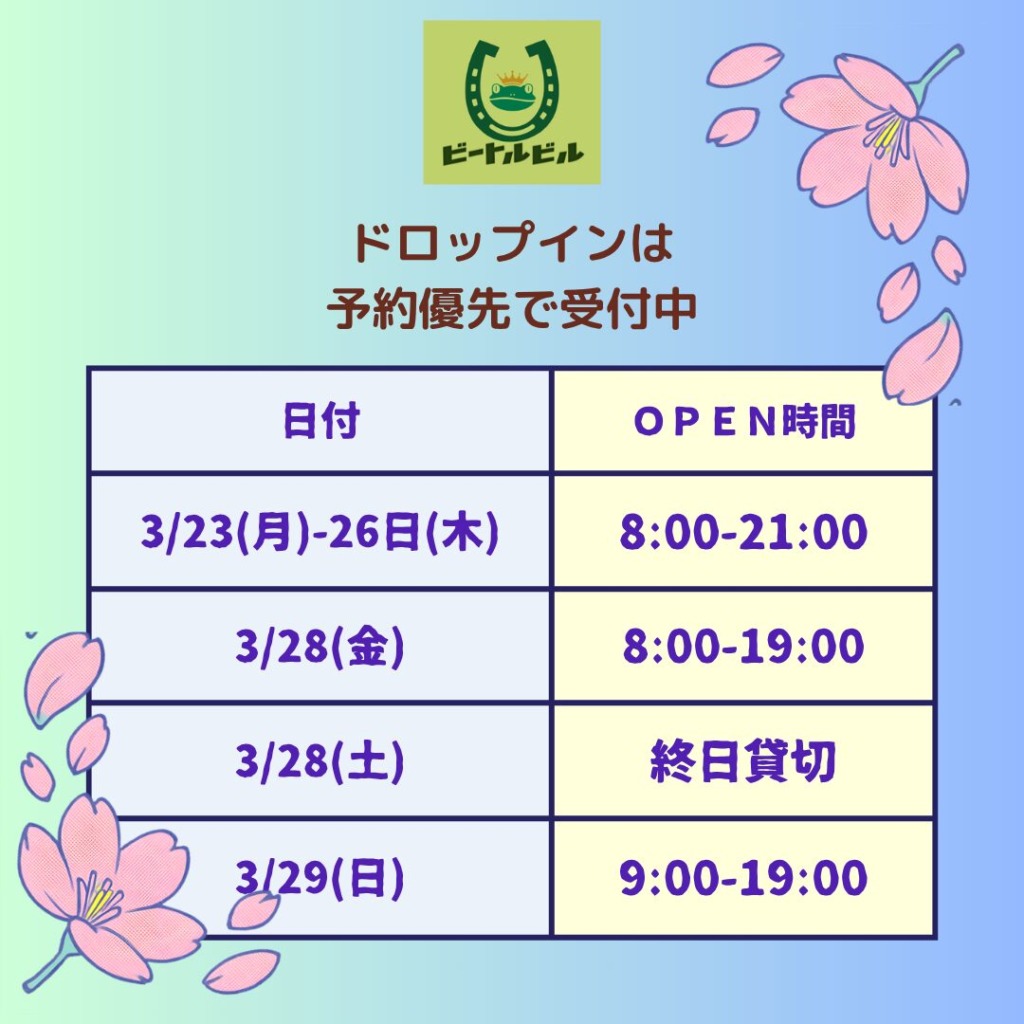 ☆3月23日 (月) 8:00~21:00 ( ドロップインは予約優先)☆3月24日 (火) 8:00~21:00 ( ドロップインは予約優先)☆3月25日 (水) 8:00~21:00 ( ドロップ…