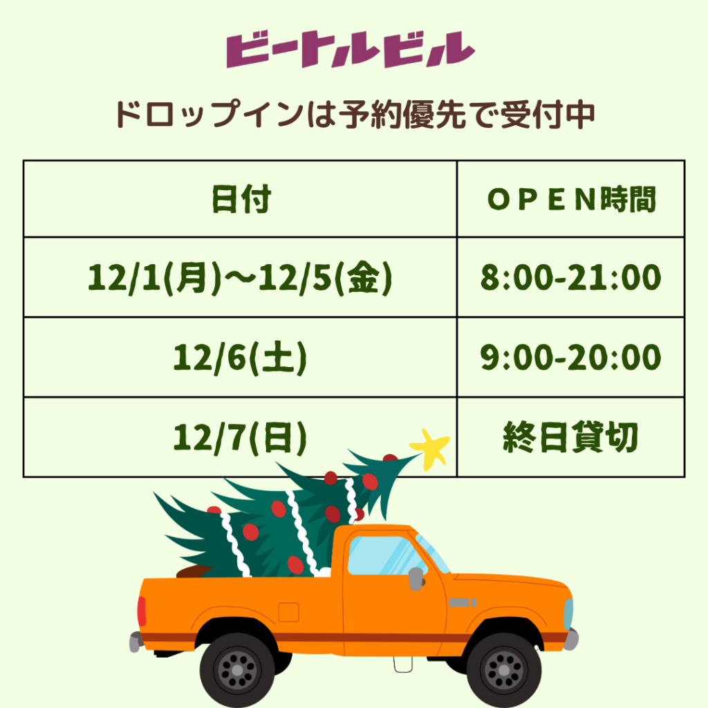☆12月1日 (月) 8:00~21:00 ( ドロップインは予約優先)☆12月2日 (火) 8:00~21:00 ( ドロップインは予約優先)☆12月3日 (水) 8:00~21:00 ( ドロップ…